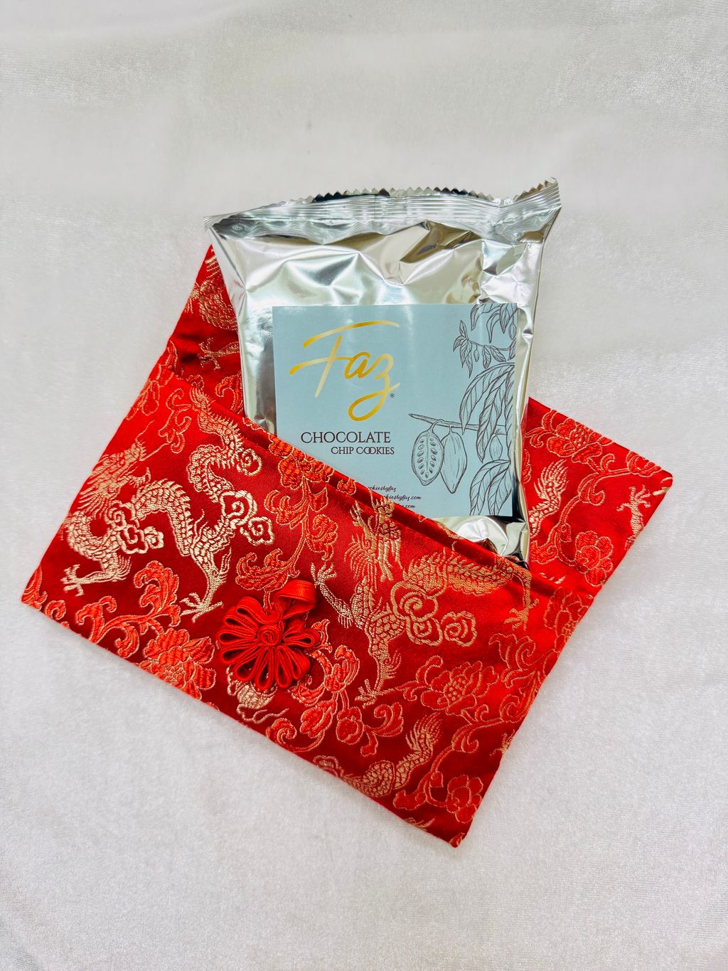 Celebrate tradition with a modern twist through the Rui Red Purse, a handmade angpao-style money packet that exudes elegance and cultural charm. Featuring intricate golden dragon embroidery, symbolizing prosperity and strength, this reusable purse is paired with delectable Faz chocolate chip cookies, making it a unique and thoughtful gift.