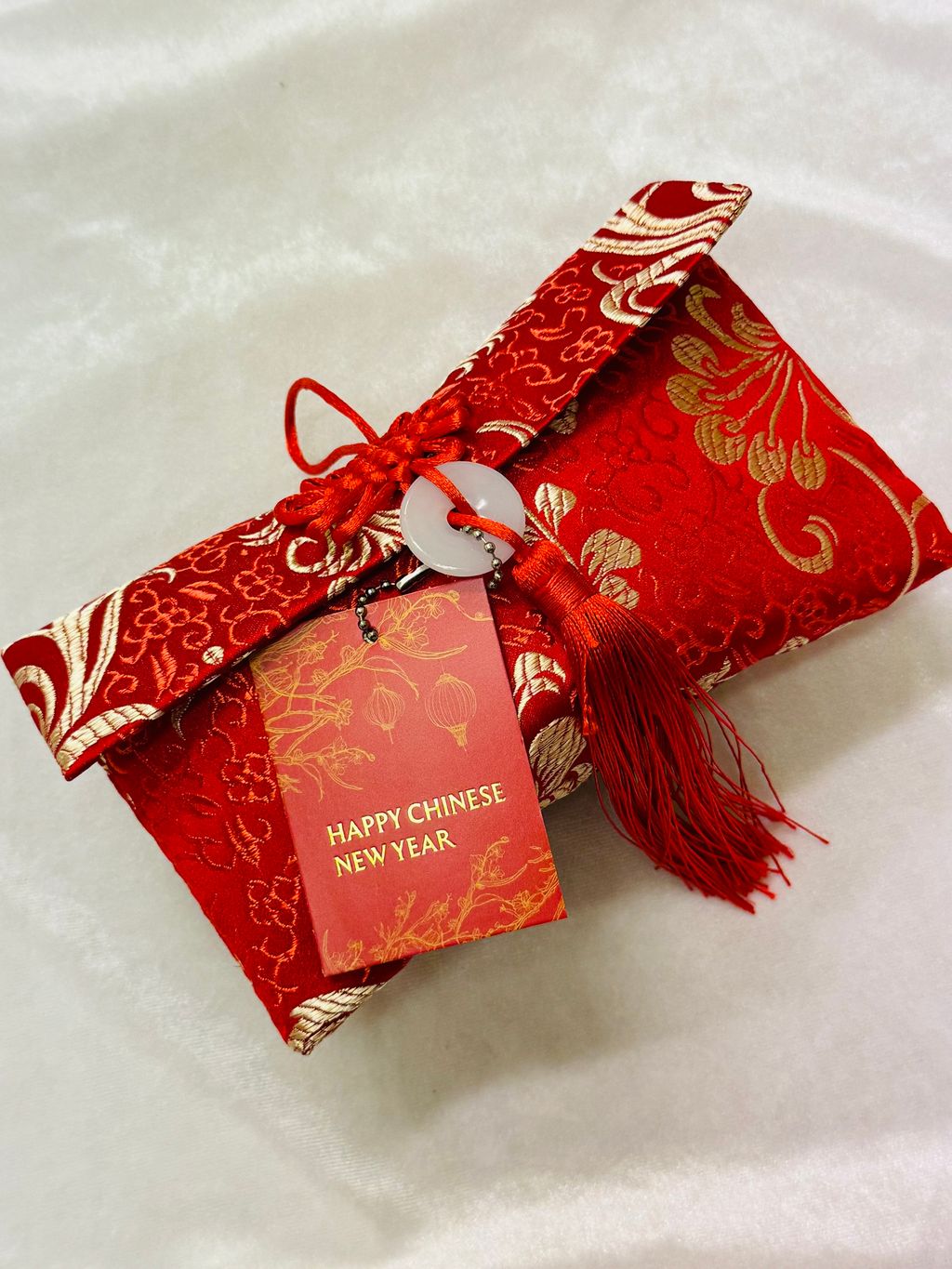 •Purse Design: Handmade with premium silk-like fabric, inspired by traditional angpao packets, and adorned with gold dragon motifs. Size: 17.5cm x 10cm.