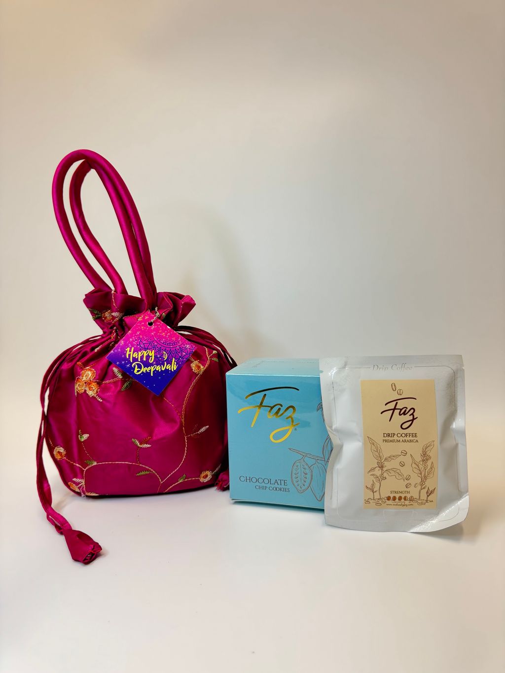 Each bag comes with a box of our signature Faz chocolate chip cookies & 2 sachets of Faz Drip Coffee.