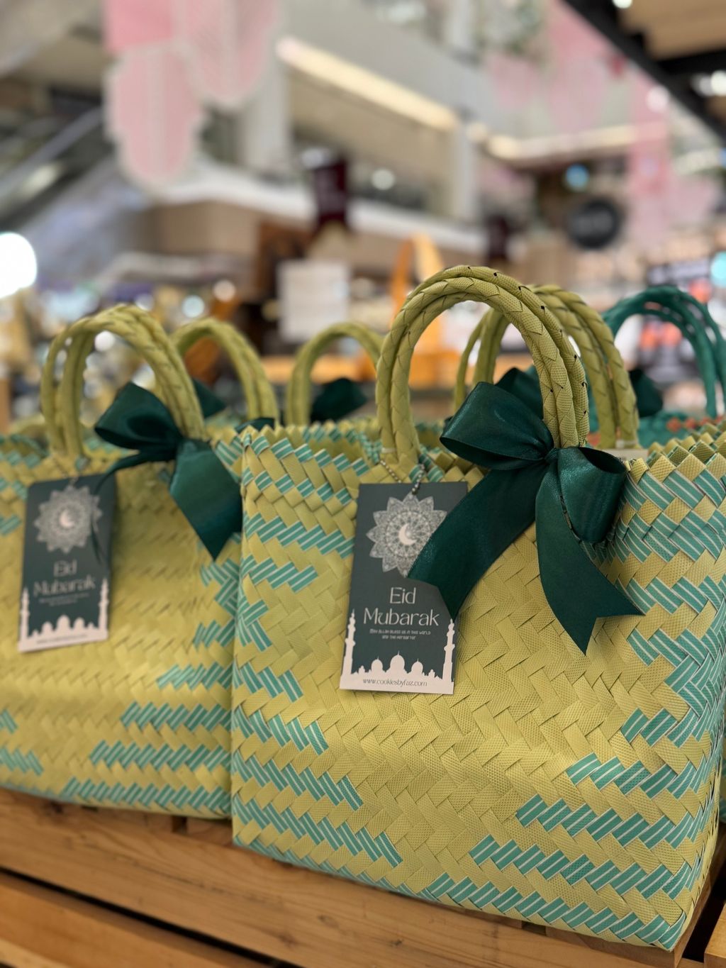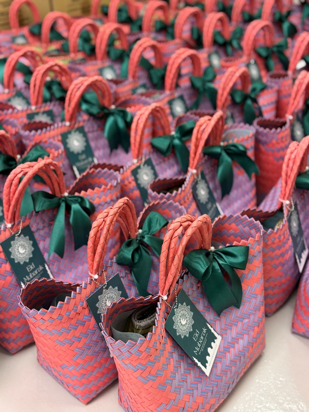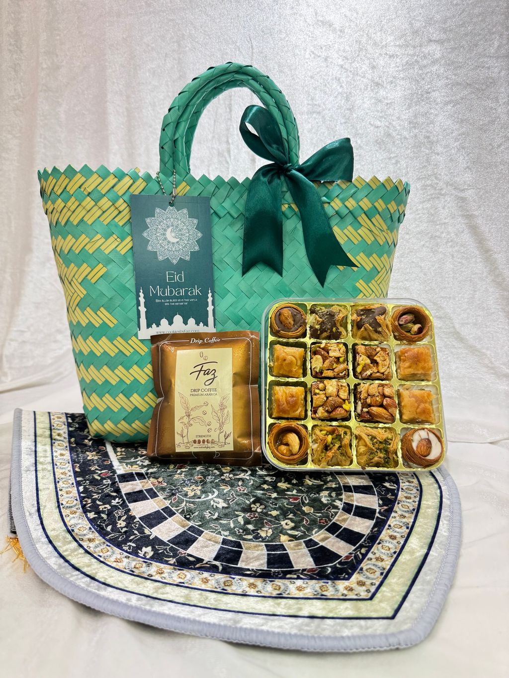A beautiful blend of Middle Eastern flavors and Malaysian craftsmanship — premium baklava nestled in handmade woven bags, paired with a mini prayer mat and aromatic premium drip coffee.