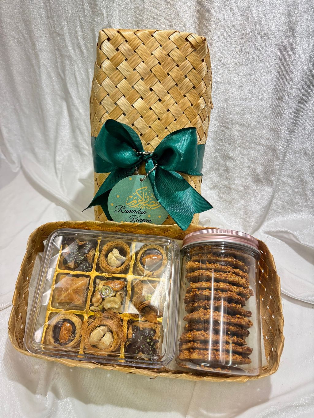 An elegant Raya Gift set inspired by Middle Eastern flavours - baklava & sesame-pistachio biscuits in handmade basket.