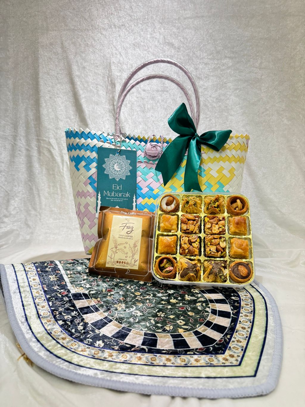 A thoughtfully curated gift set featuring a handwoven bag crafted by Penan women of Sarawak, paired with premium baklava nestled in handmade woven bags, paired with a mini prayer mat and aromatic premium drip coffee.